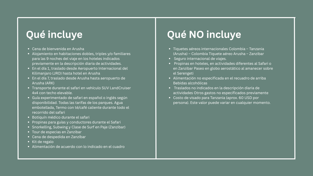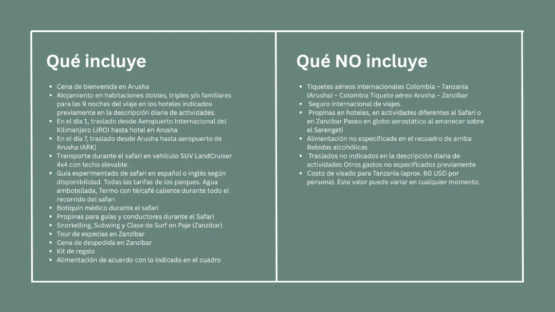 Disfruta de amaneceres y atardeceres inolvidables en la sabana. visitaremos el cráter del Ngorongoro, una maravilla natural considerada la octava maravilla del mundo. Explora la rica historia y cultura de la isla de las especias, disfrutando de playas blancas y tonalidades azules del mar de Zanzibar.